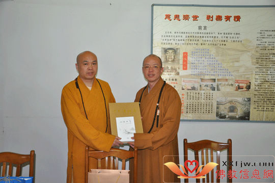江苏省佛教协会副会长、徐州市佛教协会会长、兴化寺方丈果光法师的热情接待了慧宽法师一行,陪同客人先后参观了唐宋摩崖石刻造像、大雄宝殿、大佛殿,并详细介绍了雕刻于北魏年间的大石佛,慧宽法师一行对北魏大石佛顶礼膜拜。在兴化寺会议室双方互赠了自己的著作和礼品。